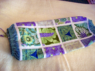 I had a lot of the fabrics left from the Ruffled Apron Swap, and a friend had asked me to make a grocery bag dispenser for her daughter. I love the bright, cheery colors of the fabrics I'd used, and they were handy, so I zipped on over to Moda Bake Shop because I remembered they had a very pretty patchwork, quilted grocery bag dispenser recipe there some time ago. I easily found the recipe, and whipped one up. Then I quickly made three more - sometimes when I make something I like, I just can't stop making more of it! My DIL, Autumn, was laughing at me because I showed her the first one I made - ok, actually, I MADE her look at it...I tell my kids they HAVE to look at my sewing stuff as part of the "rent" haha (since they don't actually pay any). She said "Is that going out the door?" I said yes...and she giggled and said "Umm...so YOU are going to keep using the grocery bag dispenser you have? THE PLASTIC BAG FULL OF PLASTIC BAGS, hanging on the pantry doorknob???"